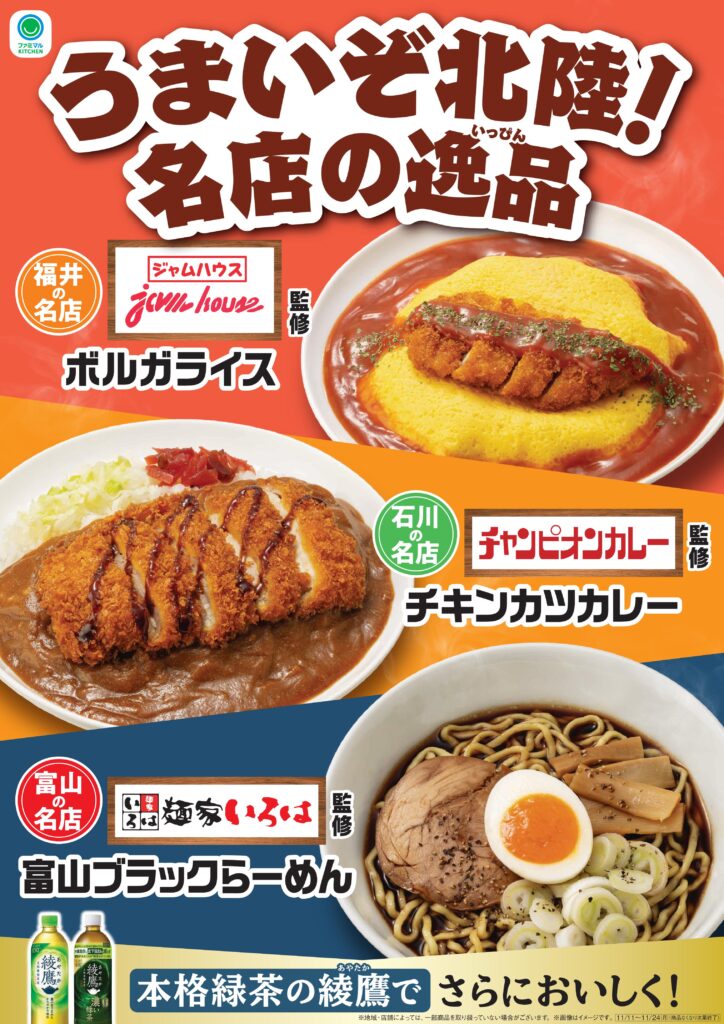 いつもチャンピオンカレーをご利用いただき、誠にありがとうございます。このたび、株式会社ファミリーマート(本社:東京都港区、代表取締役社長:細見 研介)が実施する「うまいぞ北陸!名店の逸品」フェア(11月11日開始)にて販売される「チャンピオンカレー監修チキンカツカレー」を監修しました。今回のフェアは北陸3県を代表する飲食店が監修するご当地グルメを一堂に集めた地域限定企画で、北陸3県のファミリーマートで販売されます。石川県からは当社チャンピオンカレー、福井県からは洋食の名店「ジャムハウス」、富山県からは「麺家いろは」が参加しています。北陸の食文化を代表する名店の一つとして、地域の皆さまに愛される味をお届けできることを嬉しく思います。ぜひファミリーマートにて、チャンピオンカレーならではの濃厚な味わいをお楽しみください。